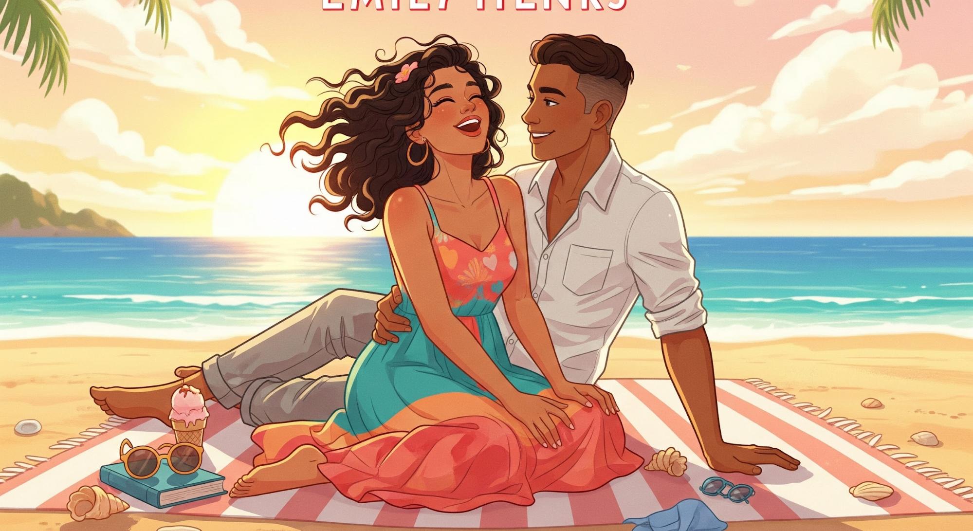 Romantic couple on the beach illustration, Emily Henry book cover style